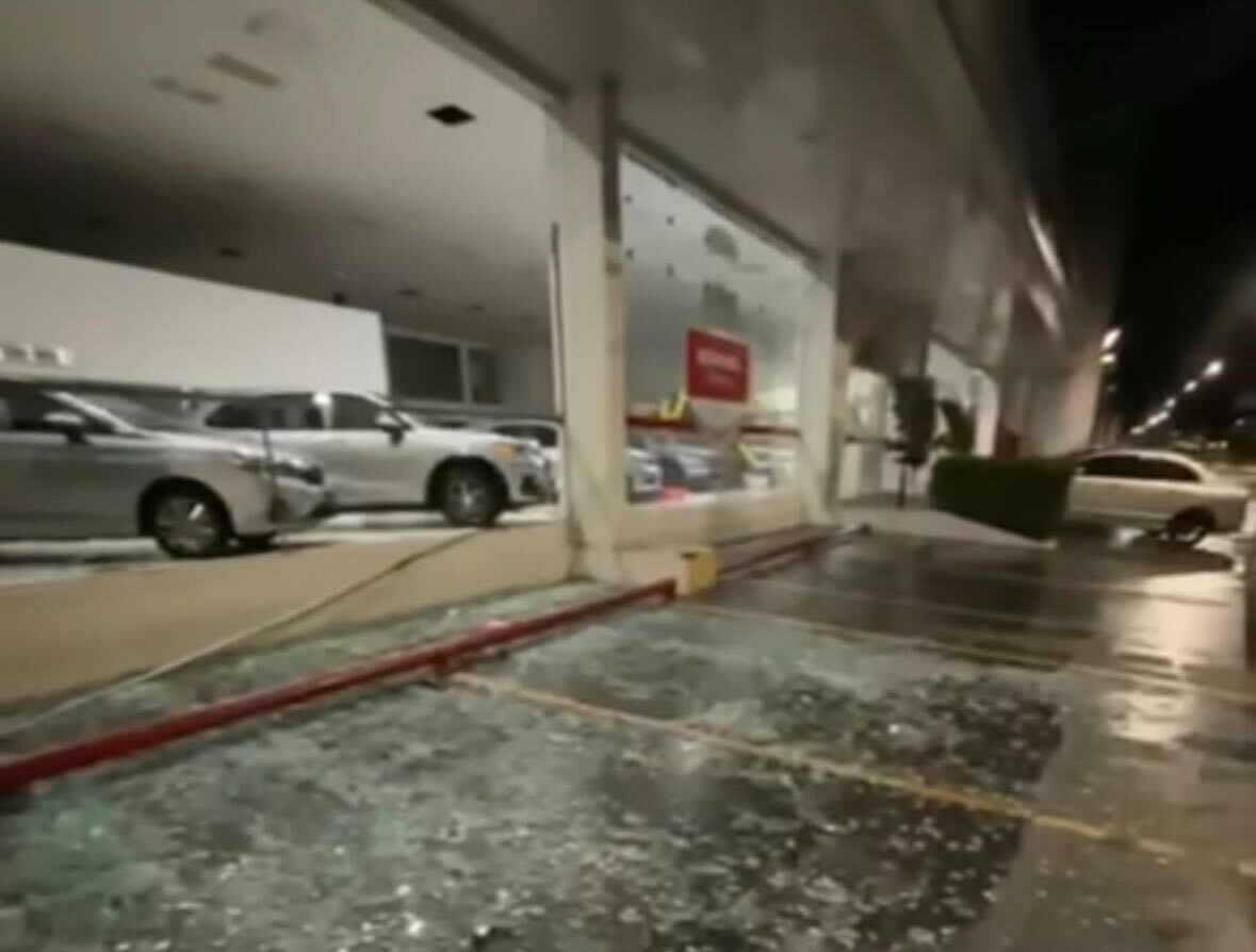 Uma concessionária de veículos e uma loja de tintas tiveram os vidros quebrados em decorrência da força do vento. Não há registro de feridos.