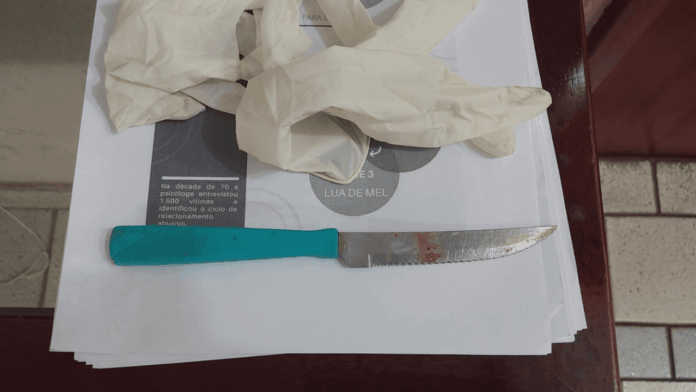 Dentro do imóvel, a mulher foi encontrada no quarto do casal, ensanguentada, com hematomas pelo corpo e ferimentos de faca no pescoço e nas costas, supostamente desferidos pelo marido.