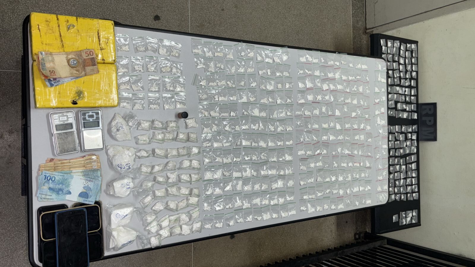 Ao todo, foram apreendidos dois tijolos de pasta base de cocaína, 463 porções da mesma droga, 12 comprimidos de anfetamina, além de R$ 1.560 em dinheiro e cinco aparelhos celulares.