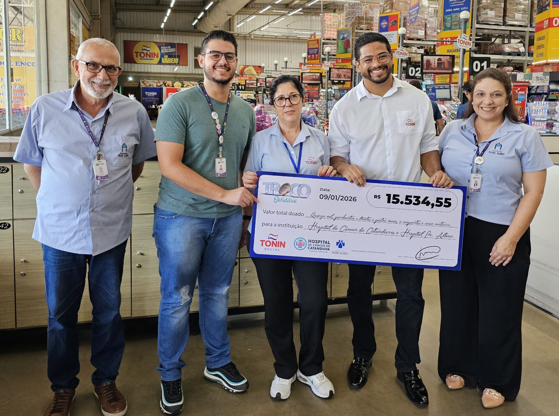 No dia 6 de fevereiro, o Hospital de Câncer de Catanduva (HCC) recebeu o produto final da campanha Troco Solidário do Tonin Superatacado, realizada ao longo de 2025. A iniciativa arrecadou R$ 15.534,55, valor doado por clientes que contribuíram com parte do troco ao realizarem pagamentos em dinheiro.